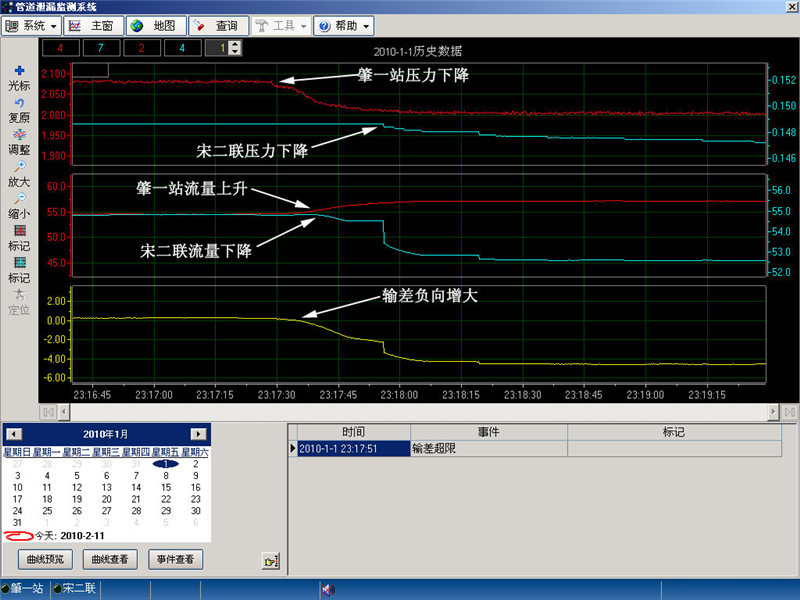 2010年1月1日肇一站-宋二聯(lián)管線泄漏報(bào)警曲線圖
