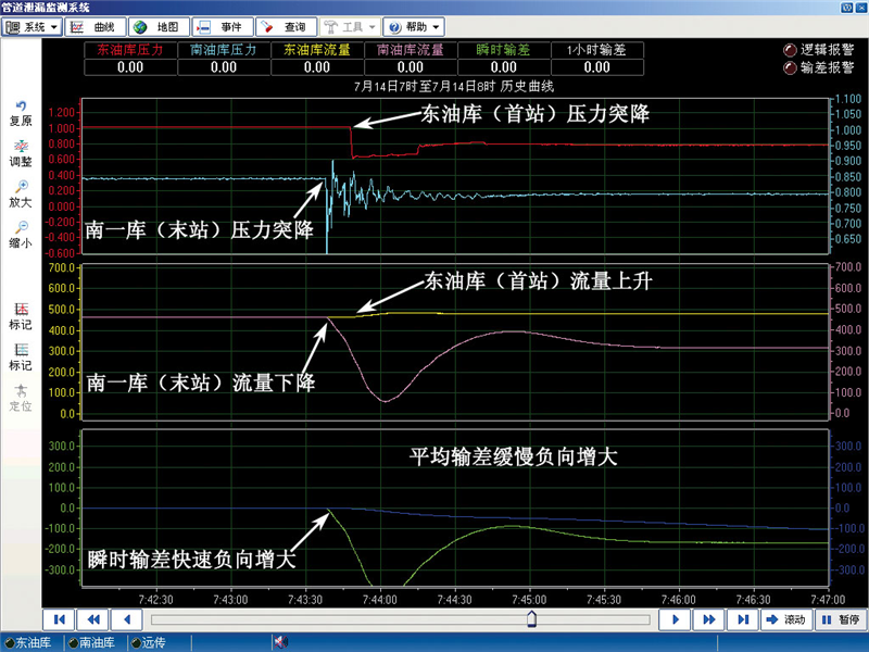 2007年7月14日7時43分37秒東油庫—南一庫輸油管線發(fā)生泄漏,系統(tǒng)在7時44分09秒報警,定位泄漏位置在距東油庫13.76公里處,工作人員同時上報,在7時55分30秒處理完畢。該次泄漏為施工挖掘機(jī)意外挖破管道造成。