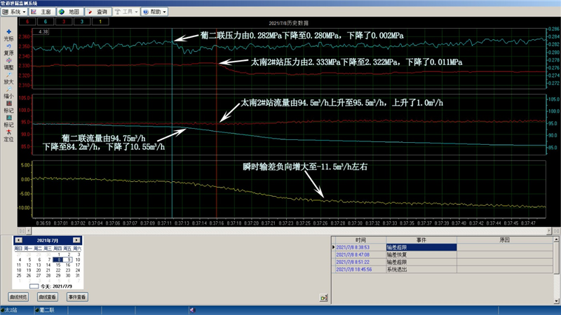 2021年7月8日8時37分12秒發(fā)生泄漏,38分53秒系統(tǒng)報警,定位在距太南2#站8.0公里處。泄漏發(fā)生時太南2#站壓力由2.333MPa下降至2.322MPa,下降了0.011MPa;流量由94.5m3/h上升至95.5m3/h,上升了1.0m3/h。葡二聯(lián)壓力由0.282MPa下降至0.280MPa,下降了0.002MPa;流量由94.75m3/h下降至84.2m3/h,下降了10.55m3/h;瞬時輸差下降至-11.5m3/h左右。