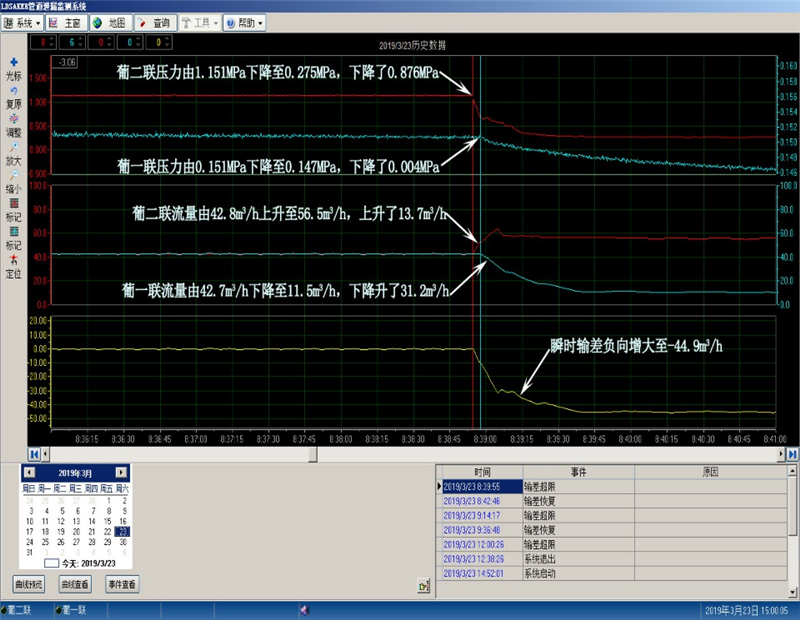 2019年3月23日葡二聯(lián) - 葡一聯(lián)輸油管線發(fā)生泄漏,系統(tǒng)紀錄顯示:8時38分55秒泄漏開始,泄漏監(jiān)測系統(tǒng)于8時39分55秒發(fā)出報警,報警原因為“輸差超限”,系統(tǒng)定位在距葡二聯(lián)5.60公里處。