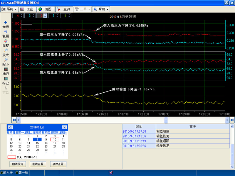 2010年9月8日朝六聯(lián)-朝一聯(lián)管線泄漏系統(tǒng)報(bào)警曲線