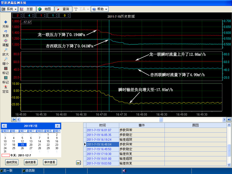 7月19日龍一聯(lián)-杏西聯(lián)管線泄漏報警曲線圖