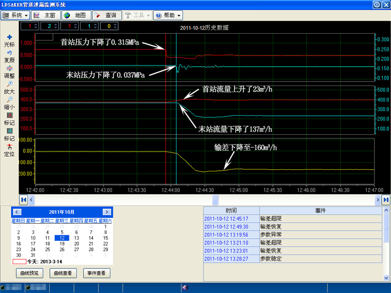 大慶油田某采油廠A站-B站輸油管線長(zhǎng)17.3㎞,管徑ф429㎜,日輸原油12000m3。 2006年11月安裝LD-SAKER管道泄漏監(jiān)測(cè)系統(tǒng)。2011年10月12日12時(shí)43分55秒發(fā)生泄漏:系統(tǒng)在45分17秒報(bào)警,定位泄漏位置在距首站3.67公里處,管理部門處理果斷、及時(shí),整個(gè)過(guò)程僅用時(shí)3分53秒,將損失降到了*小。此次泄漏因挖掘機(jī)施工造成,平均瞬時(shí)泄漏量約160m3/h。